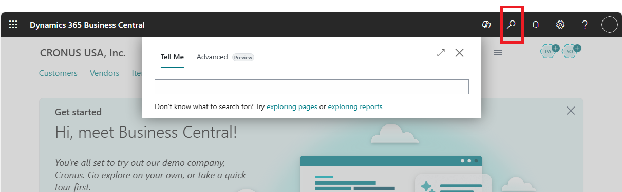 - This feature is available in Business Central online only, not on-premises, and only when an admin enables Feature: Advanced Tell Me (preview) in the Feature Management page. Learn more in Feature Management.